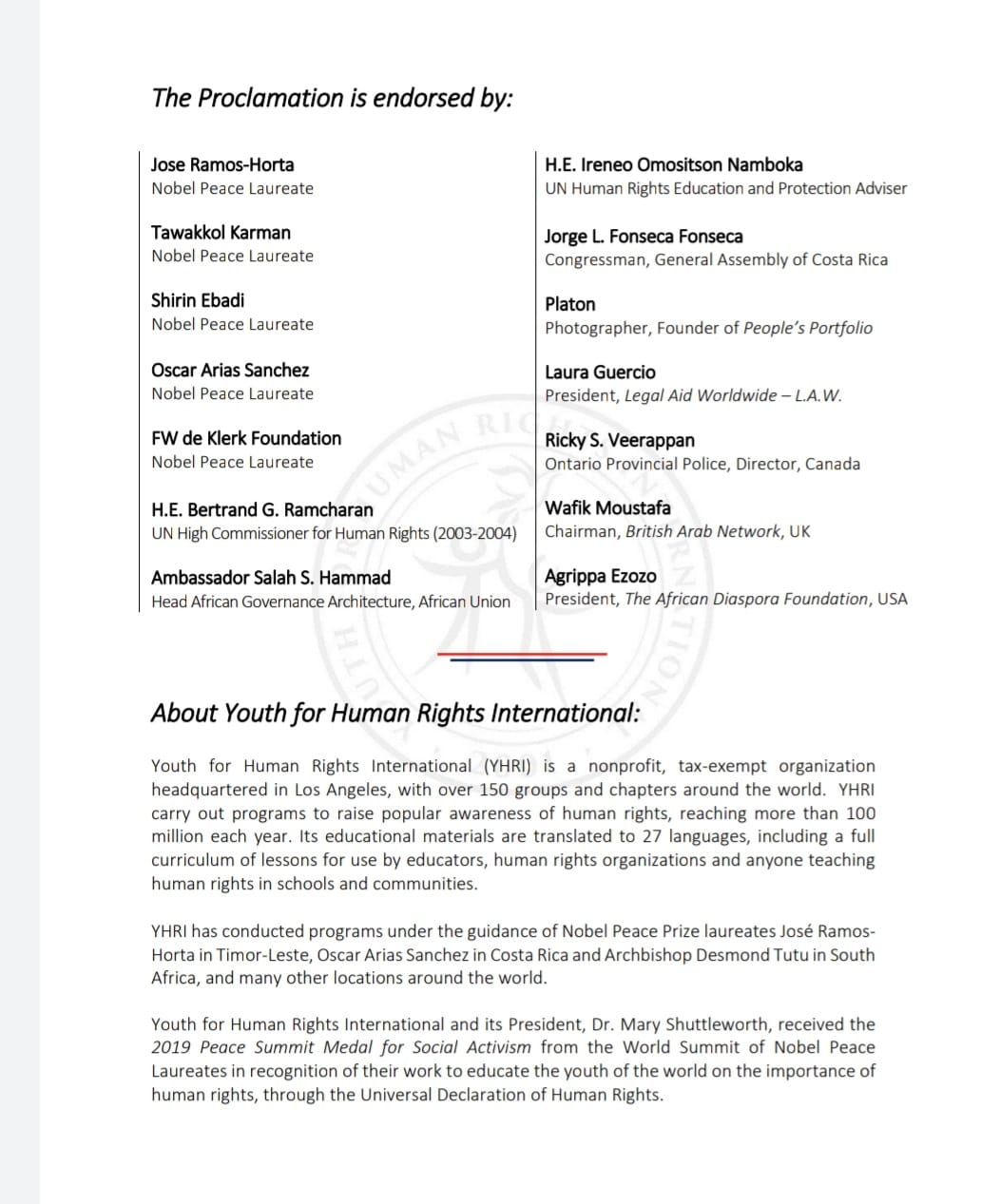Nello stesso giorno TERRA DI LIBERTA’ OdV inaugurerà il suo nuovo sito internet terradiliberta.org, dove, oltre a molti contenuti sulle attività dell’associazione, sarà possibile trovare il proclama originale e la traduzione in Italiano che a partire dal 21 settembre verranno inviati a membri delle istituzioni, associazioni per i Diritti Umani, leader religiosi ed insegnanti invitandoli a firmare il documento già sottoscritto da diverse personalità a livello mondiale.