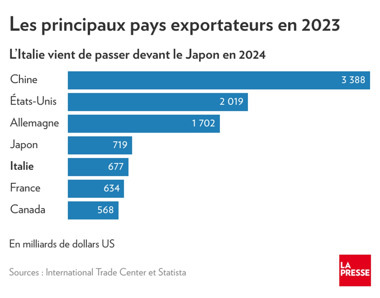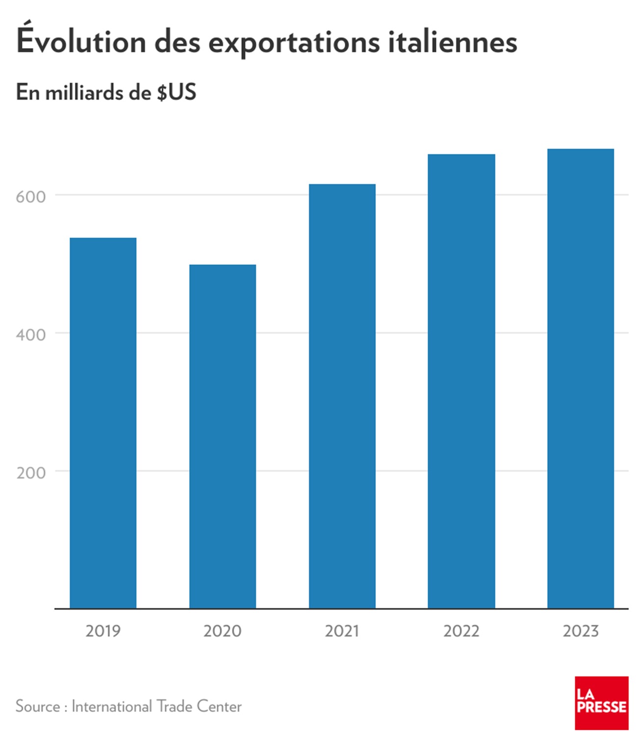 Depuis 10 ans, discrètement, l’Italie a doublé la France, la Corée du Sud, et finalement le Japon cette année. La valeur des exportations italiennes a augmenté de 48 % entre 2016 et 2023, comparativement à des hausses respectives de 28 % pour la France et de 27 % pour l’Allemagne.