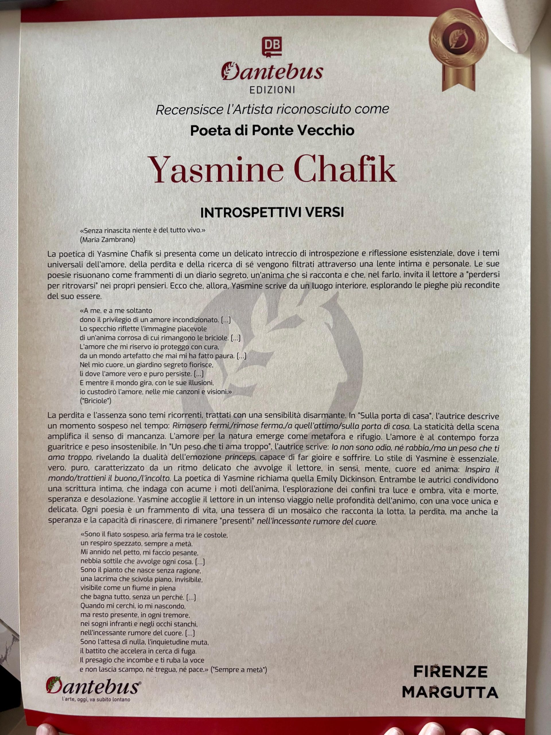 Yasmine Chafik, cittadina italiana di origine marocchina appartenente alla seconda generazione di marocchini in Italia, ha recentemente pubblicato la sua prima opera poetica all’interno della raccolta collettiva “I Poeti di Ponte Vecchio”, edita dalla prestigiosa casa editrice italiana Dantebus Edizioni.