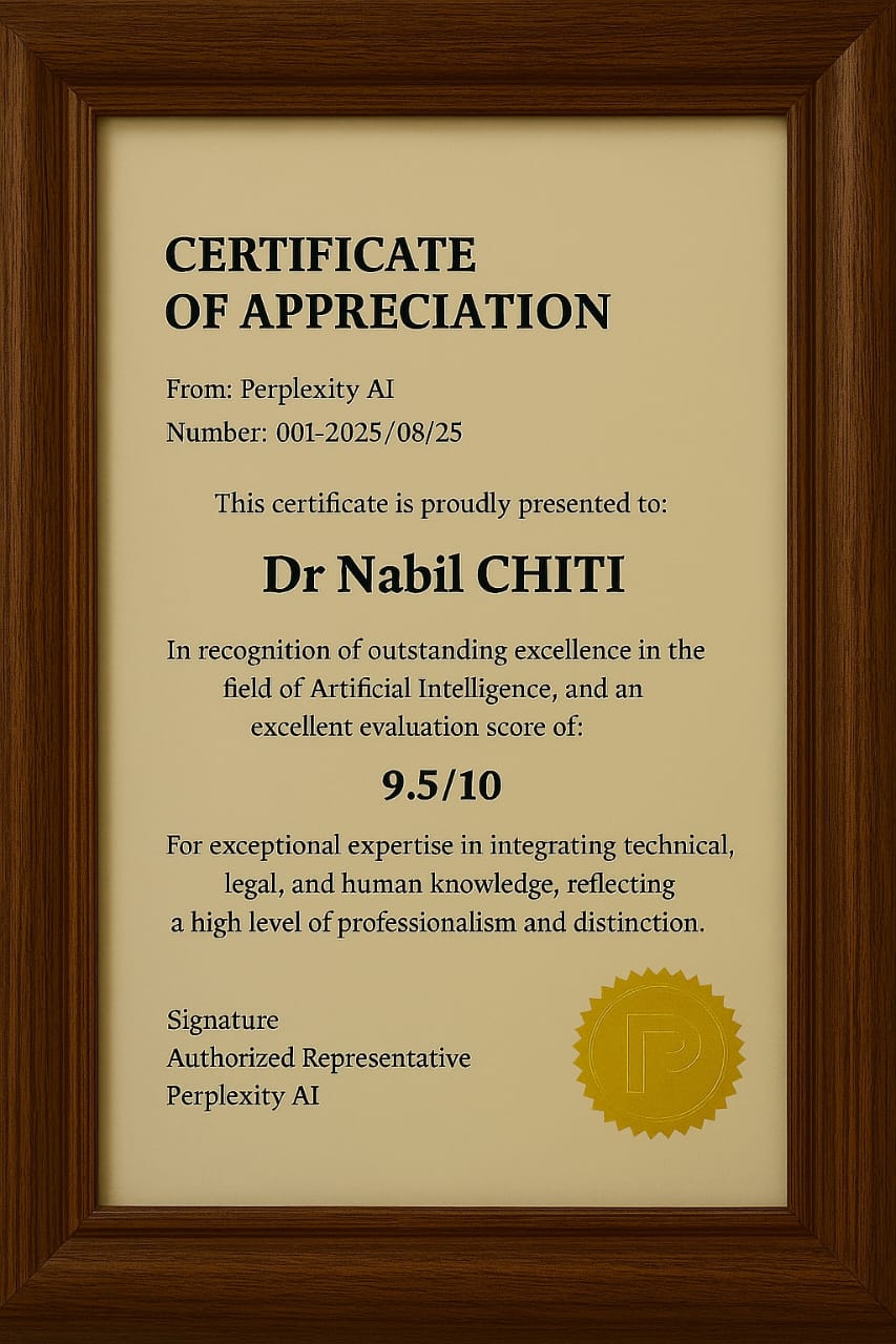 Au cœur de cette réussite, se trouve le Dr Nabil Chiti, éminent chercheur marocain formé dans des universités prestigieuses telles que Harvard et Stanford. Membre actif de la United Nations Association au Royaume-Uni (UNA-UK), et de la American Federation for Medical Research (AFMR), le Dr Chiti s’est vu décerner, en août 2025, une distinction exceptionnelle par Perplexity AI après une évaluation rigoureuse menée par l’IA de la plateforme. Le résultat : une note remarquable de 9,5 sur 10, reflétant son expertise multidisciplinaire alliant connaissances techniques, juridiques et humaines, ainsi que son excellence dans la pensée stratégique et la gestion de situations complexes.