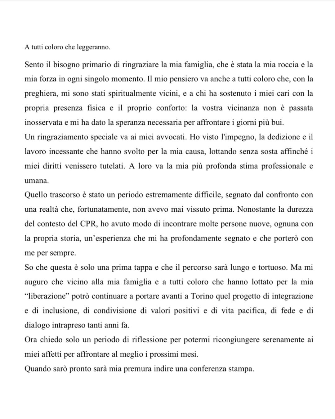 Comunicato stampa dell’imam Mohamed ShahinSpazio per il cittadino By italiatelegraph Articolo pubblicato : 16 Dicembre 2025 21h30min Share italiatelegraph Comunicato stampa dell’imam Mohamed ShahinOggi condividiamo le sue parole.Un messaggio di gratitudine, dignità e umanità dopo giorni difficili che non dovrebbero appartenere a nessuno.La sua liberazione è una gioia, ma anche un promemoria: dietro ogni caso ci sono persone, famiglie, storie di vita e di impegno che meritano rispetto.Continuiamo a tenere alta l’attenzione, con responsabilità e cura.La solidarietà non è un reato. I diritti non sono negoziabili.italiatelegraph Share